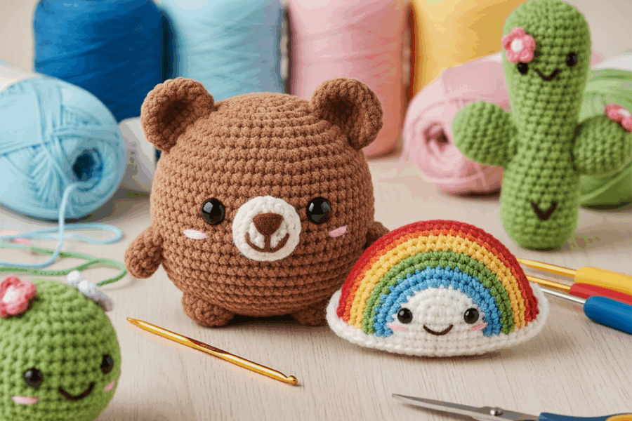This scene captures the heart of AmyLiva Handmade—a gentle gathering of crocheted amigurumi characters, each radiating warmth and whimsy. A smiling rainbow, a flower-crowned cactus, a soft brown bear, and a cheerful green companion sit surrounded by pastel yarns and crafting tools. Every stitch tells a story of care, creativity, and soulful ritual.