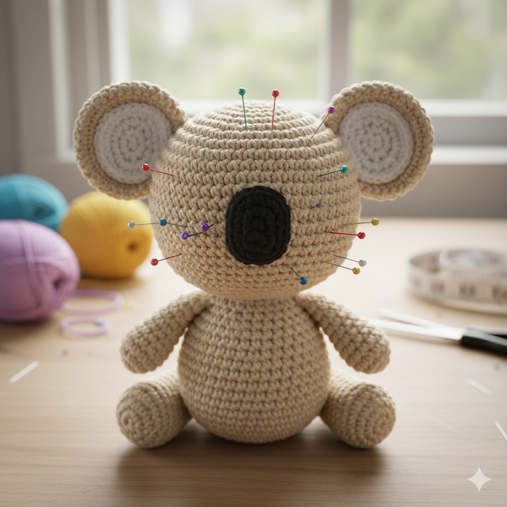 1. Pinning: Before sewing anything, use pins to temporarily attach the limbs, ears, and snout. Stand the amigurumi toy upright and check the symmetry from all angles.