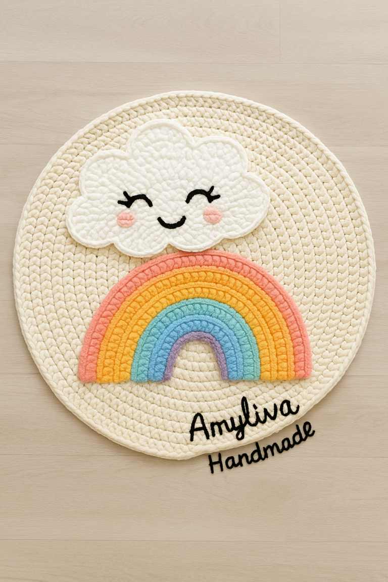 A soft and cheerful crochet rainbow rug featuring a smiling cloud, designed with pastel velvet yarn. Perfect for nursery decor and handmade lovers — created by Amyliva Handmade.
