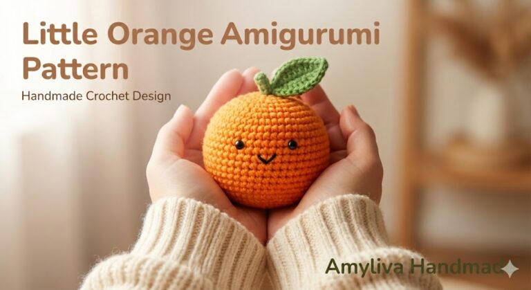 This image serves as the warm, inviting cover photo for the Amyliva Handmade blog post titled “Little Orange Amigurumi Pattern.” The focal point is a cute crocheted orange with a smiling face and leaf detail, held gently by hands wearing a cozy knitted sweater. The layout features the main title and subtitle in soft brown brand colors in the top left corner, with the brand signature in the bottom right. The overall aesthetic is professional yet “cozy,” optimized for Pinterest pins and blog sharing.