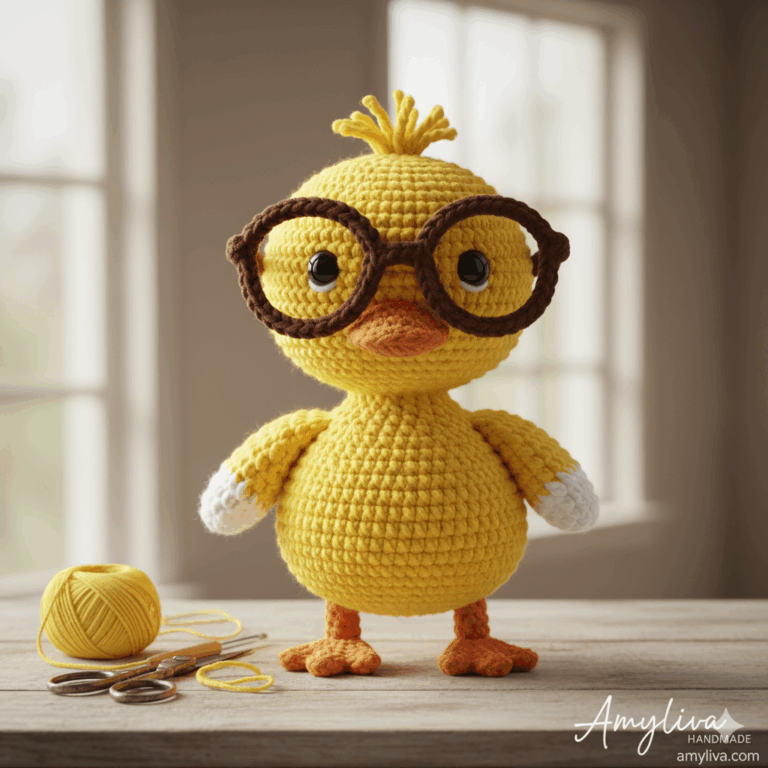 Bring this charming mini crochet duck to life! Follow the Amigurumi Duck Pattern step by step, from body to wings, beak, and glasses, and create your own handmade Amyliva Duck.