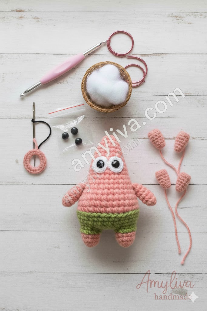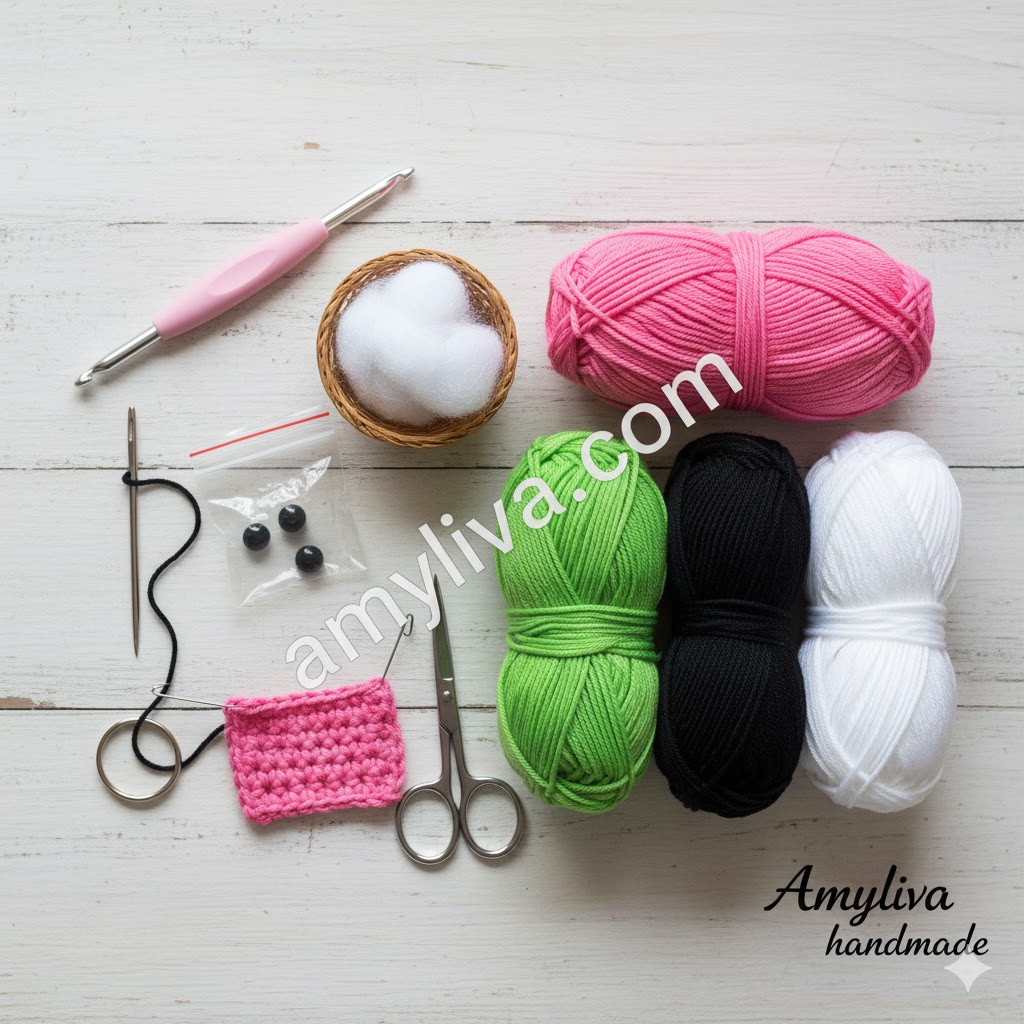 | Yarn | Pink, Bright Green, Black, White (Medium/Worsted Weight – #4) | Body, Shorts, Eyes, Mouth | Acrylic or Cotton yarn works best for clear stitch definition. |