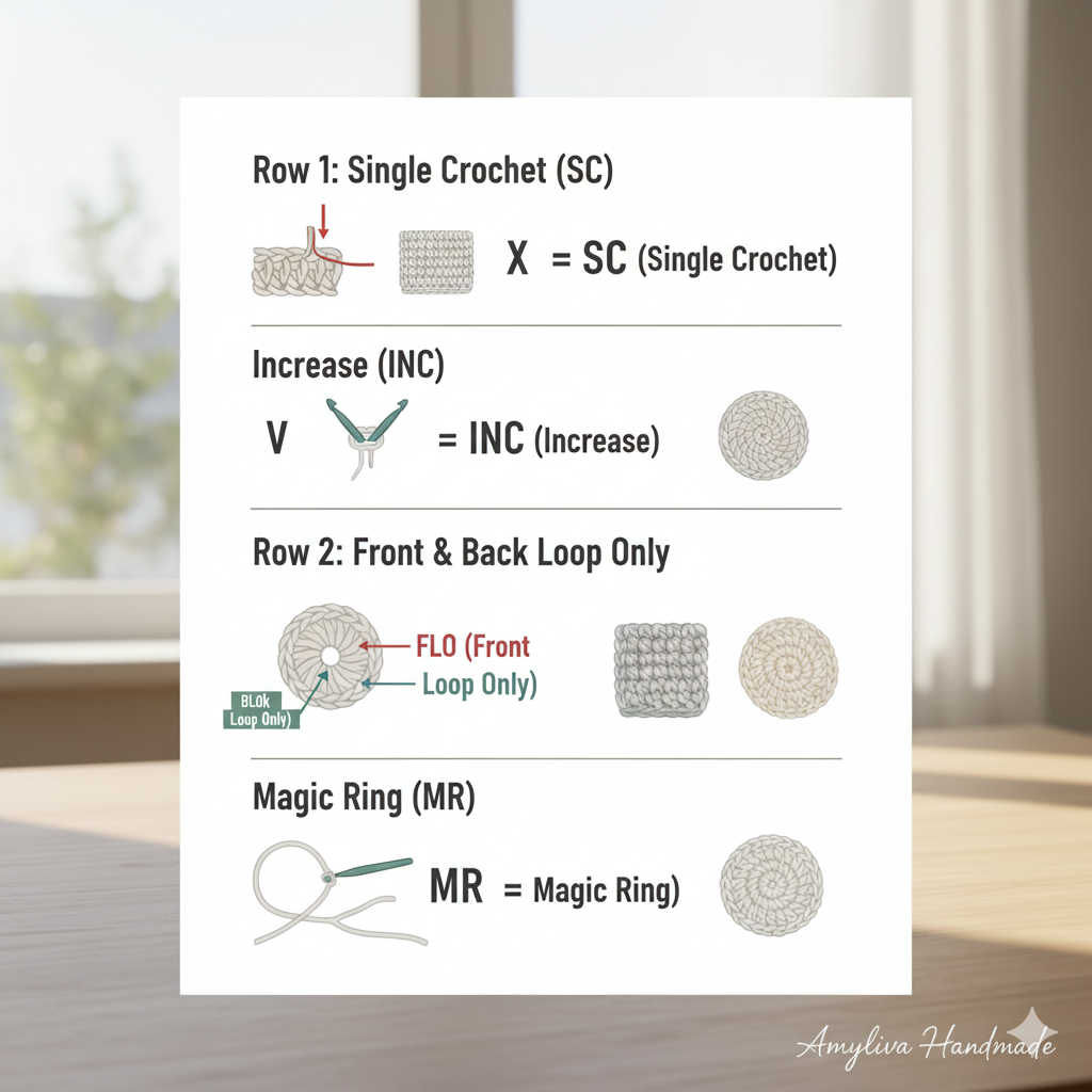 • R1 (Base): Work 8 sc into a Magic Ring (MR) (8 sts).