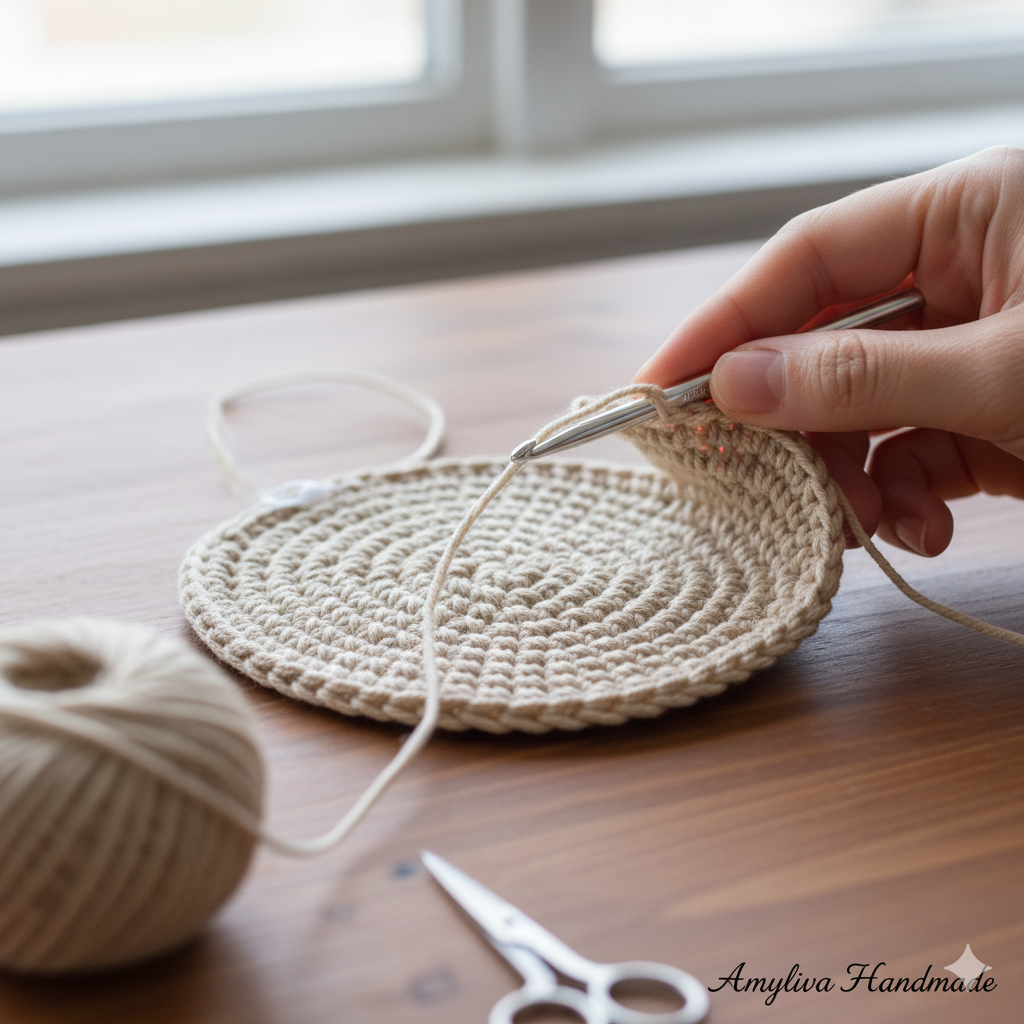 • Detail: This FLO round creates the final line where the pot’s rim will naturally fold. Fasten off and weave in the end securely.