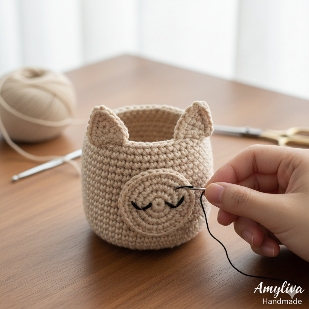 2. Attach the Face and Ears: Sew the Face Base centrally onto the front of the pot (between R8 and R11). Use black embroidery floss to embroider two small, closed eyes and a tiny nose/mouth. Next, sew the two Ears firmly to the top rim of the pot, spaced evenly above the face.