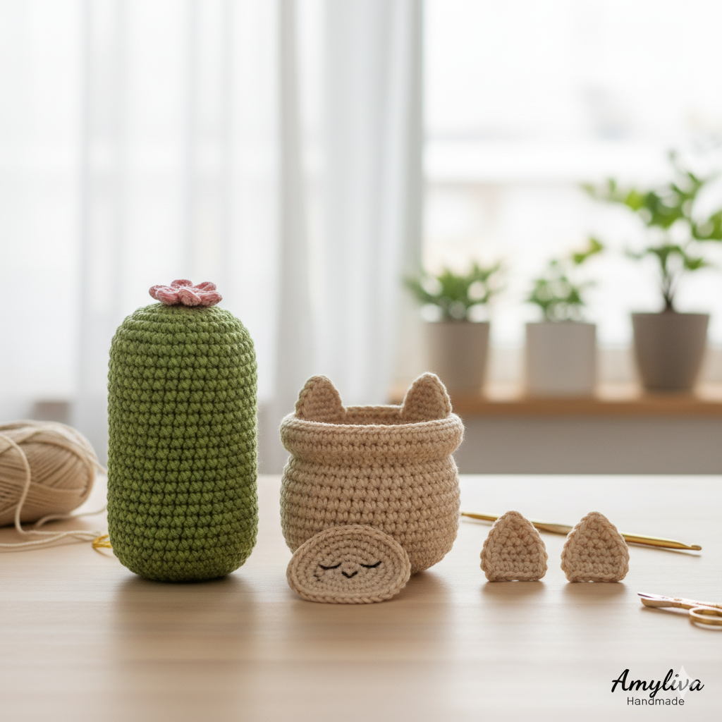 The assembly process brings your pieces together into the final adorable Cat Cactus Amigurumi.