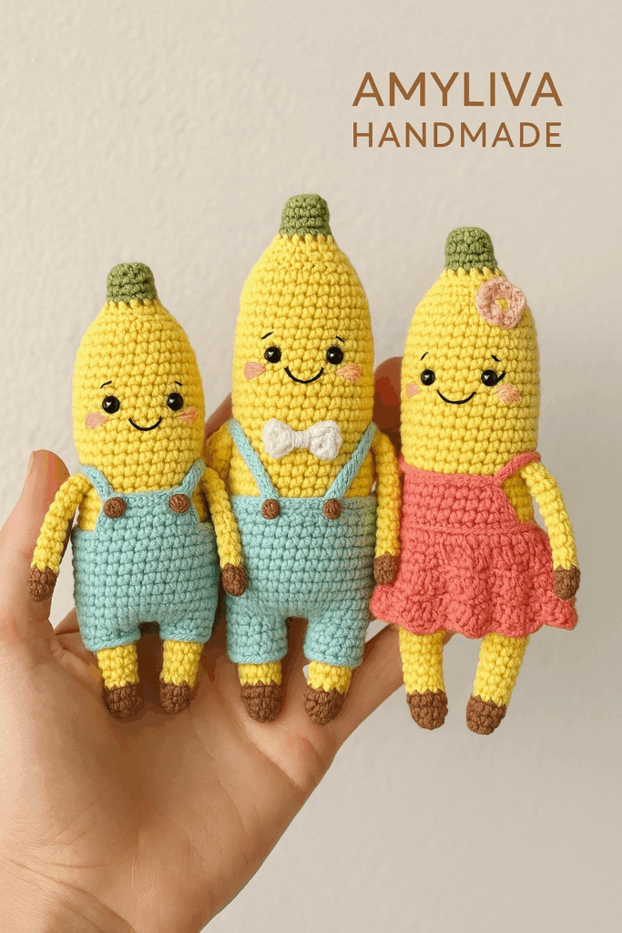 Want to add these sweet banana dolls to your collection? Visit amyliva.com for more handmade designs, crochet creations, and exclusive collections!