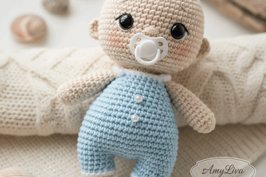 Handmade Pacifier Baby Romper Amigurumi by AmyLiva Handmade – Soft cotton yarn, safe eyes, and miniature pacifier, perfect for decoration or collectible display.