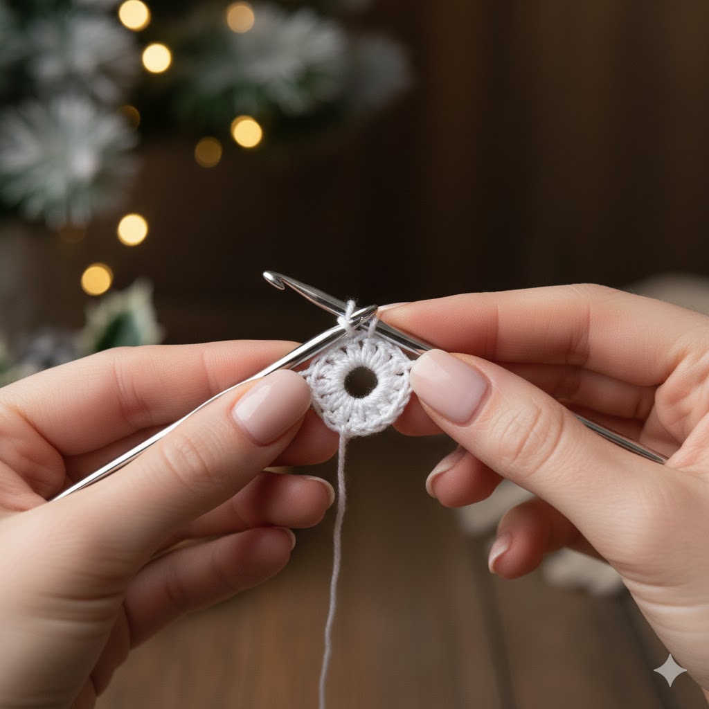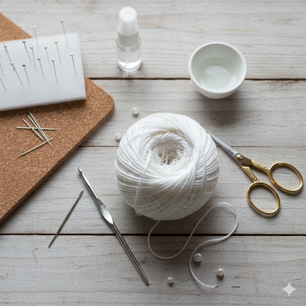 • Yarn: Fingering or 4-ply cotton yarn (white, pearl, or icy blue). Approximately 5–10 g per snowflake.