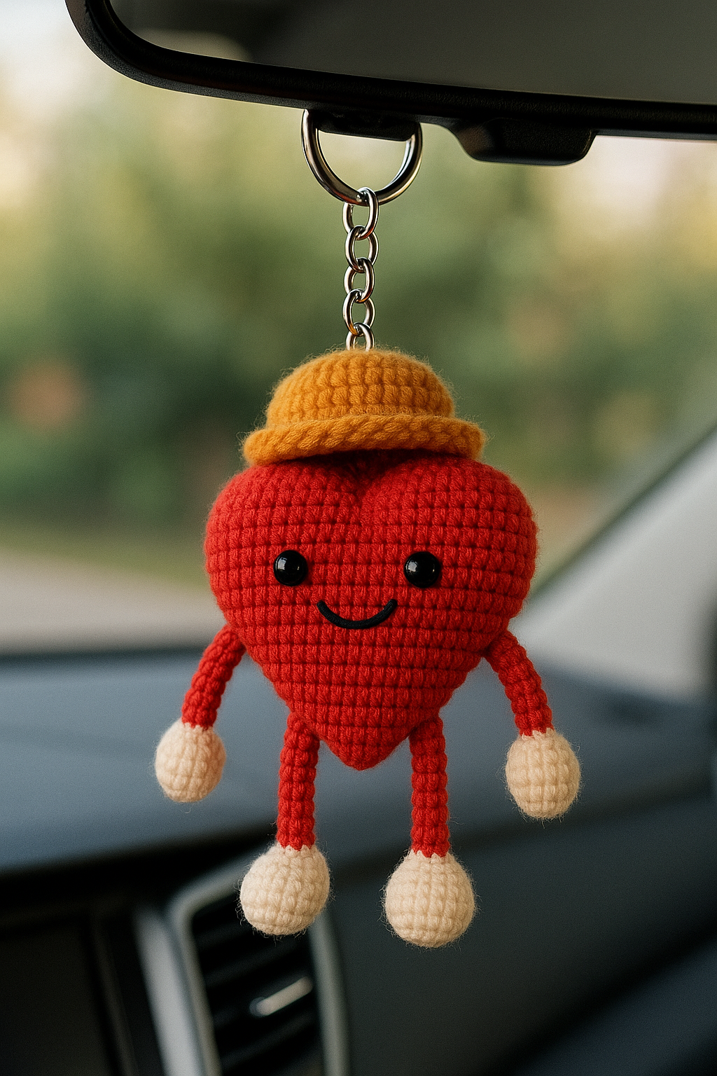 A close-up of a handmade amigurumi heart keychain held gently in a person’s hand. The…