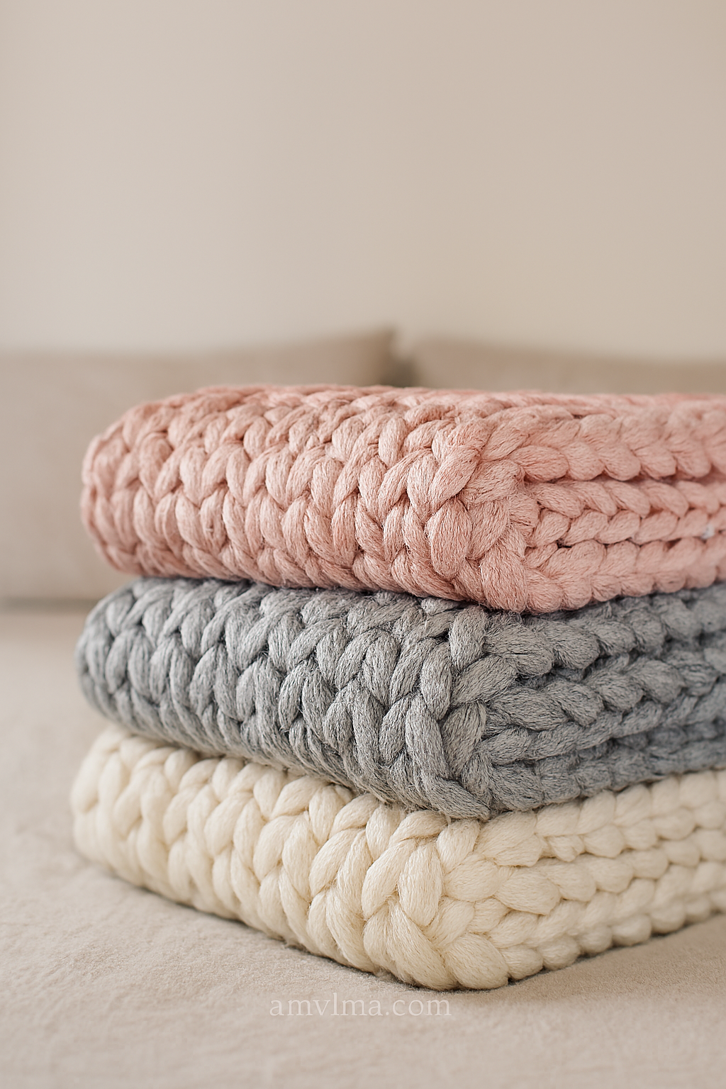 Silk Harmony in Three Shades A poetic trio of hand-knitted blankets—cream, gray, and blush pink—folded…