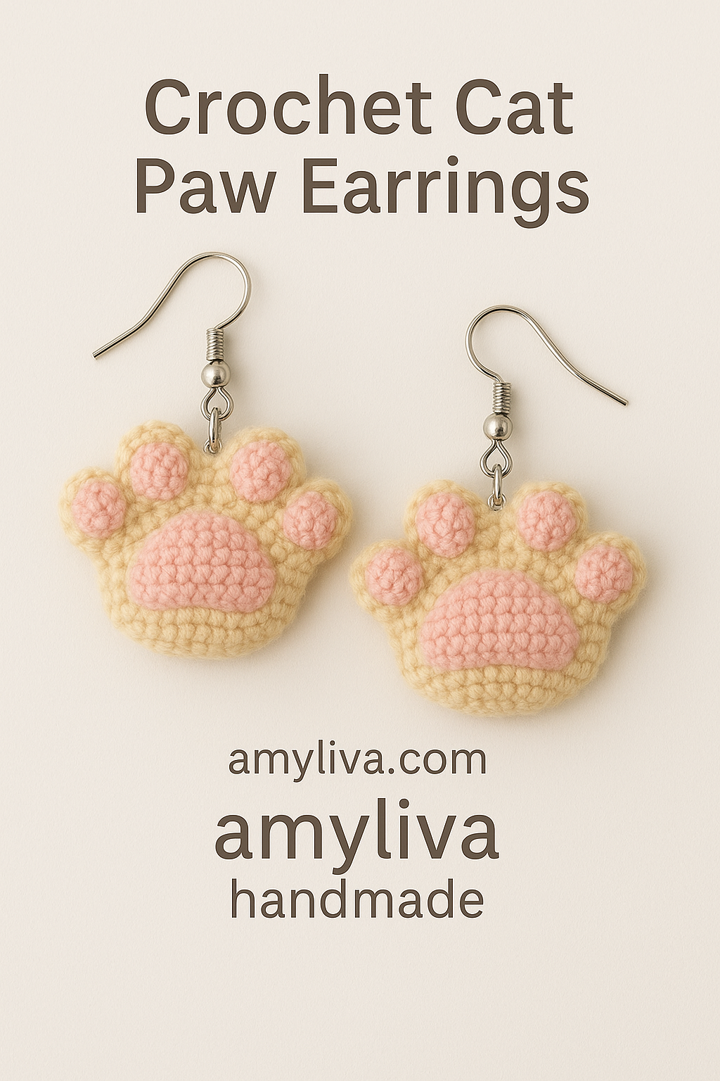 Handmade crochet cat paw earrings in multiple colors, displayed on a jewelry stand. A cute…