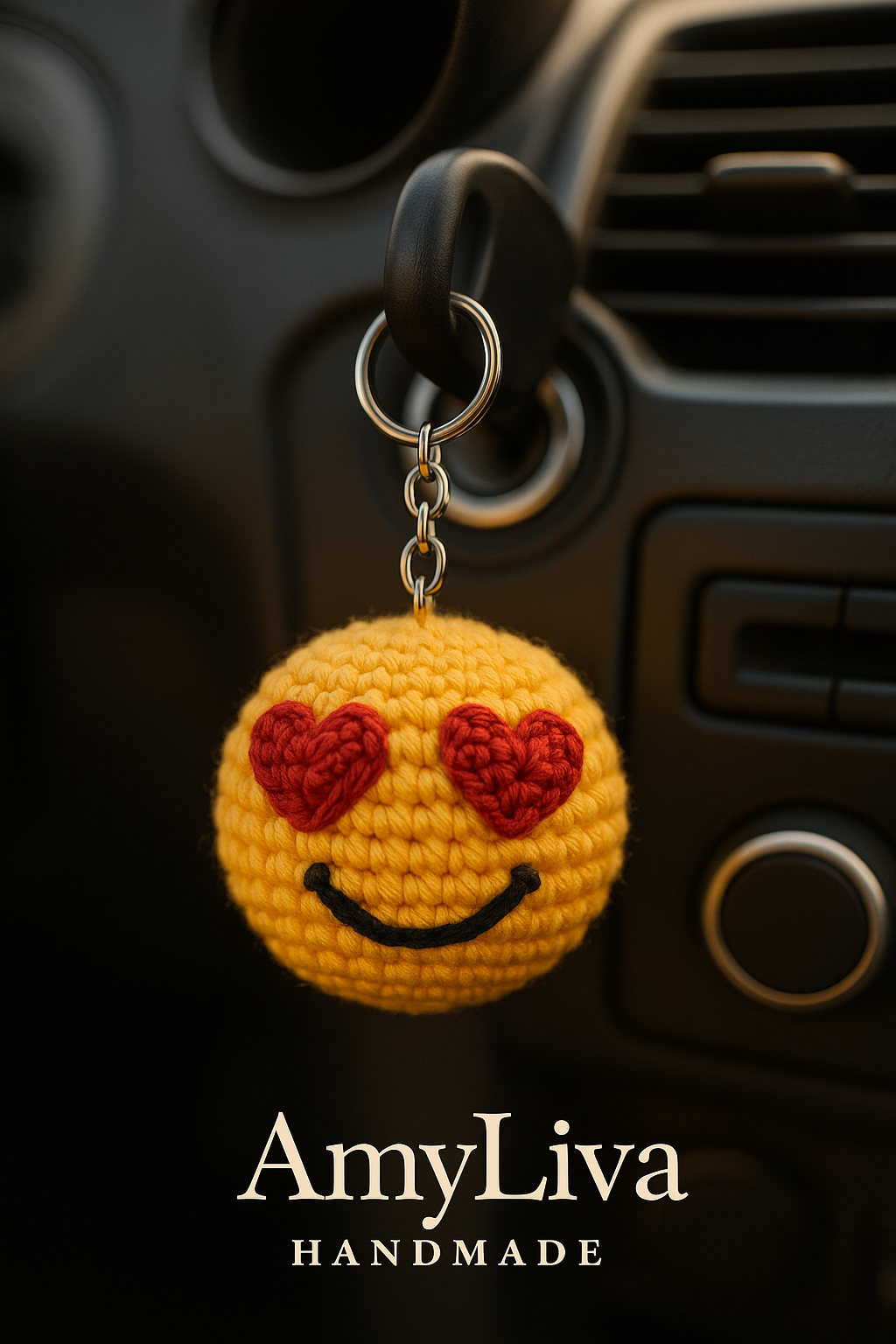 Handmade Amigurumi Heart-Eyes Emoji Keychain Brighten your day with our handmade crochet heart-eyes emoji keychain!…