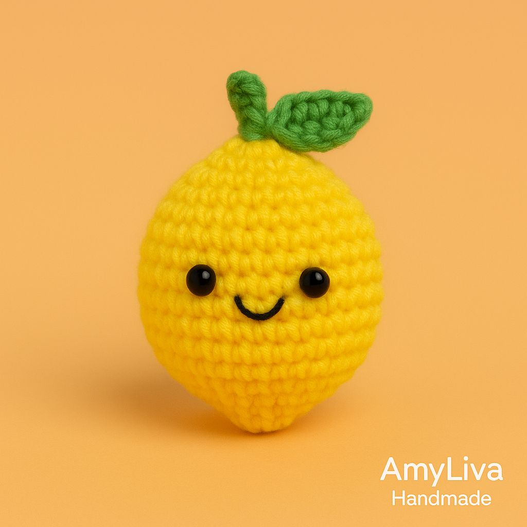 An adorable amigurumi lemon keychain named “Lila the Lemon” is hanging from a beige summer…