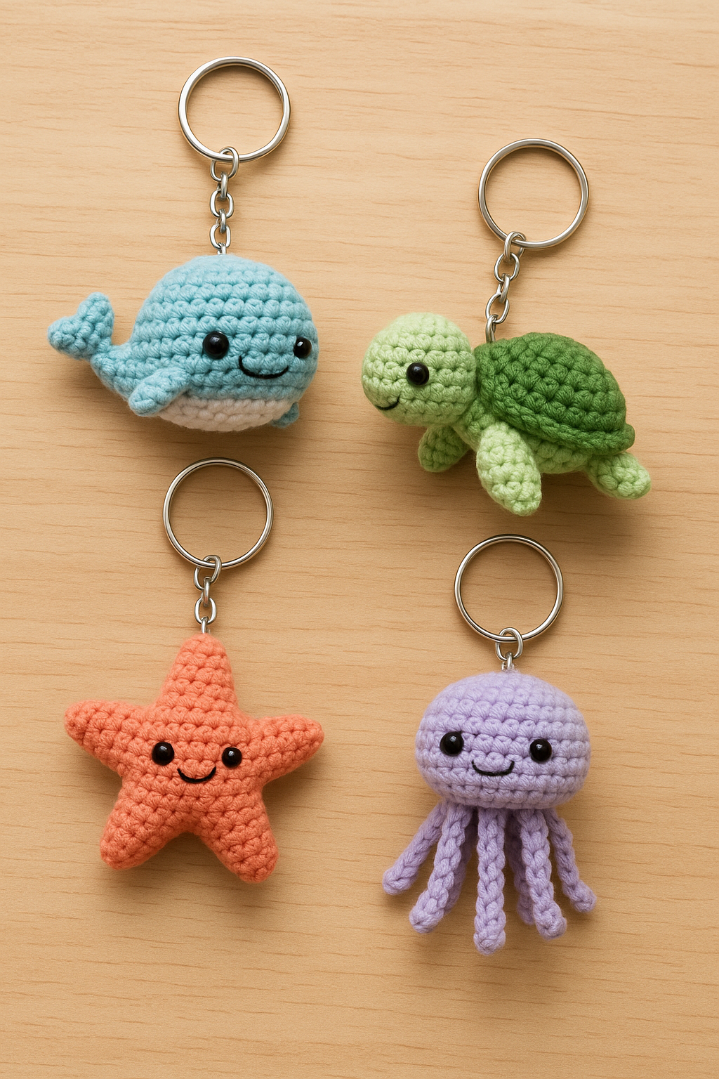 Featured Image Summary for Amyliva.com: This charming image showcases four handmade sea-themed amigurumi keychains neatly…