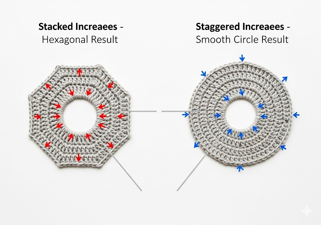 - The Solution: Shifting the Increase Point. Instead of always starting your increase sequence at the beginning of the round, shift it by half the single crochet count.