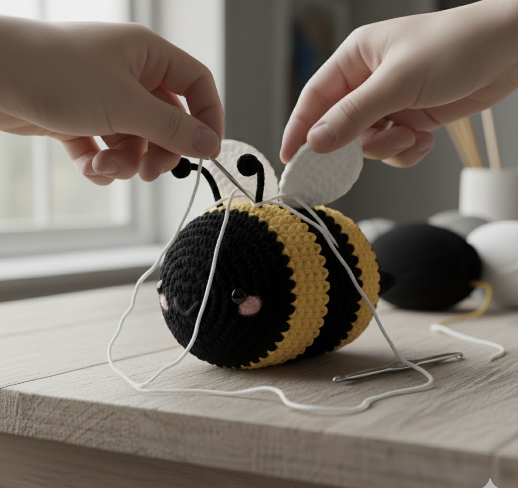 (Image 3: Finished bee showing wings and antennae – Alt text: “Completed amigurumi bee with wings and antennae attached”)