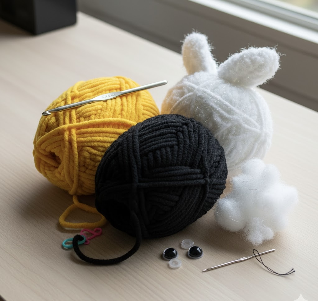 | Yarn | Worsted Weight (Category 4) or Chenille/Velvet yarn for a soft finish. Colors: Black, Yellow, White/Ivory. |